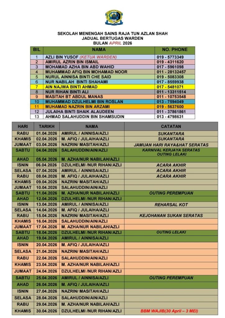 Sekolah Menengah Sains Raja Tun Azlan Shah, Peti Surat 79,34000 Taiping, Perak Darul Ridzuan, Malaysia